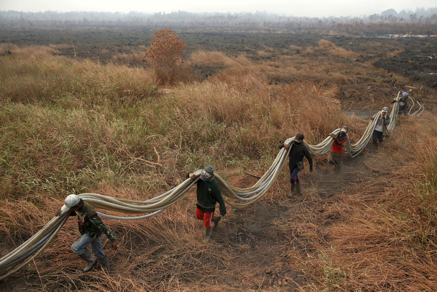 Workers bring hoses to extinguish a fire as they walk through a burned palm-oil plantation at the village of Pulo Geronggang in Ogan Komering Ilir District in Indonesia’s South Sumatra Province on September 11, 2015. Indonesia said on Friday it will send more than 10,000 troops to fight fires in southern Sumatra as smoke makes thousands sick, delays flights, and pushes air quality to unhealthy levels in neighboring Singapore and Malaysia.Beawiharta / Reuters