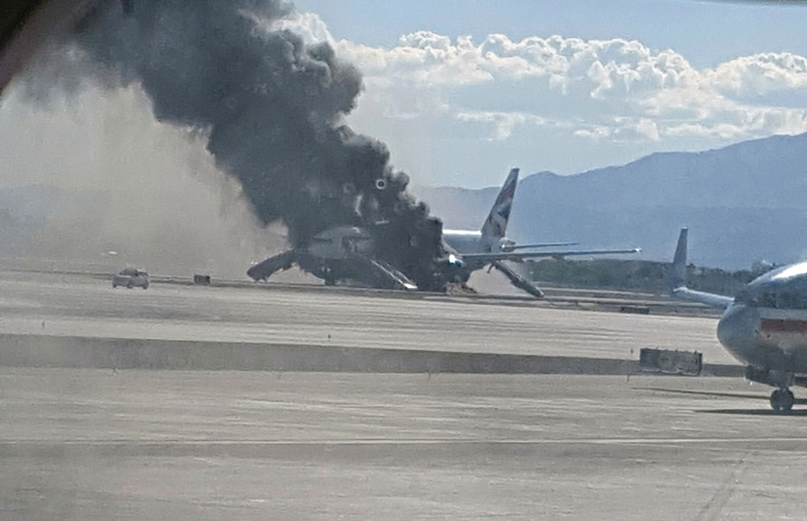 In this photo taken from the view of a plane window, smoke billows out from a plane that caught fire at McCarran International Airport in Las Vegas on September 8, 2015. An engine on the British Airways plane caught fire before takeoff, forcing passengers to escape on emergency slides.Eric Hays / AP