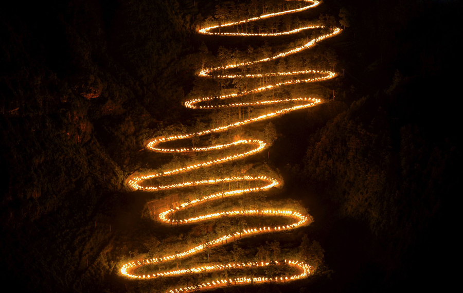 People holding torches walk on a mountain trail during a trekking event to mark the 70th anniversary of the end of World War II, in Qinglong County, Guizhou Province, China, on September 4, 2015. Around 2,974 people participated in trekking the trail, along which American aid to China was transported from Myanmar to China’s front lines during World War II, according to local media.Reuters