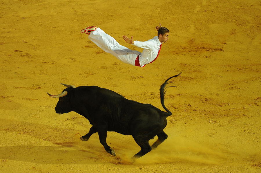Fabien Napias of the French recortadores company Passion Saltador leaps over a charging bull at the end of the Liga de Corte Puro finals at the Plaza de Toros in Valladolid, Spain, on September 6, 2015. The art consists of leaping, diving, and somersaulting over charging bulls.Denis Doyle / Getty