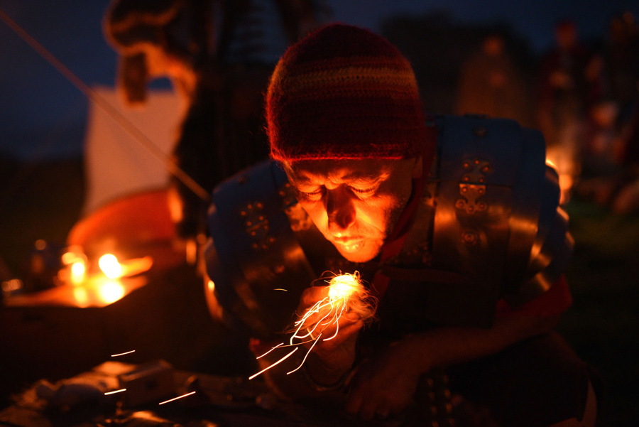 A reenactor portraying a soldier from the Imperial Roman Army blows on a spark to start a fire in their camp ahead of English Heritage’s history weekend, Hadrians Wall Live, at Birdoswald Roman Fort near Gilsland, northern England, on September 4, 2015. The Hadrian’s Wall Live event featured Roman-history reenactments taking place at various points along the length of the World Heritage Site fortification, including a battle between the Barbarian and Roman Soldiers of 143 AD.Oli Scarff / AFP / Getty