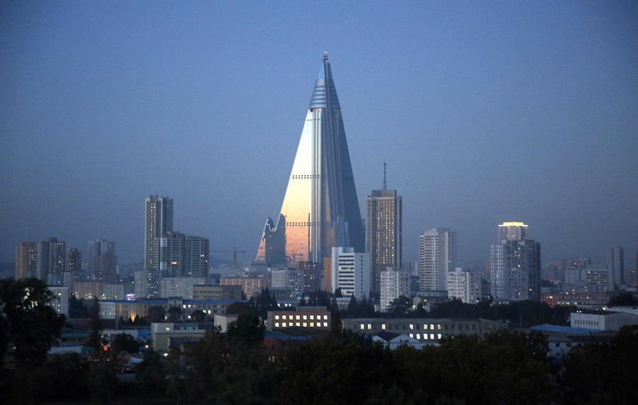 Dusk settles over Pyongyang, North Korea, on October 13, 2015, as the 105-story pyramid-shaped Ryugyong Hotel towers over residential apartments. The hotel has been under construction since 1987 and was intended to be a landmark and a symbol of progress and prosperity, but the economic difficulties that the country went through forced the project into repeated delays. Nearly 30 years later, it has become a major Pyongyang landmark, but has never been used as a hotel as it was intended.Wong Maye-E / AP