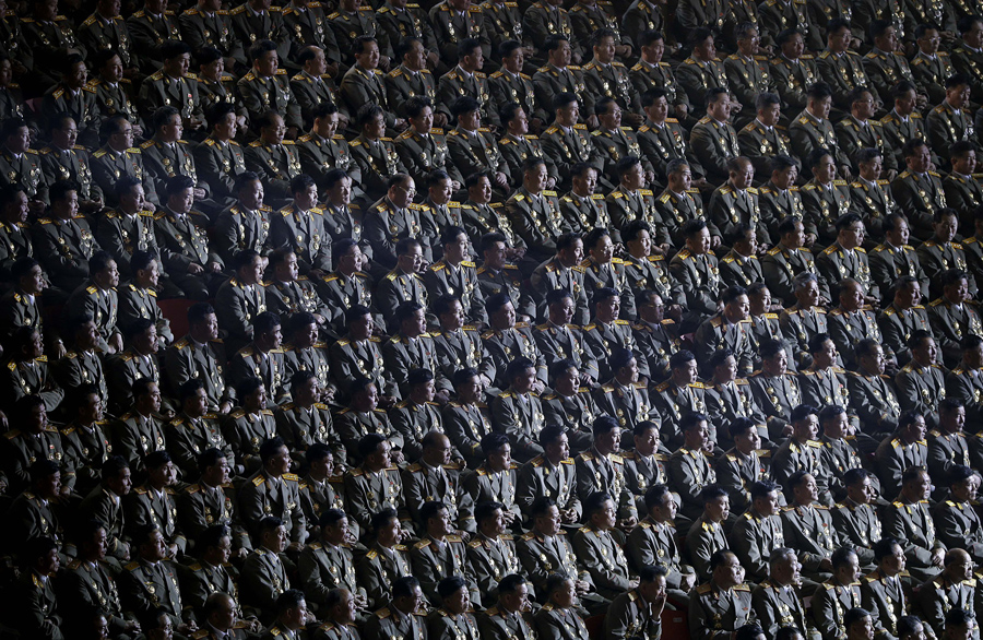 Soldiers watch a joint concert between the Moranbong Band and the State Merited Chorus in Pyongyang, North Korea, on October 11, 2015, part of the 70th anniversary celebrations of the founding of the ruling Workers' Party.Wong Maye-E / AP