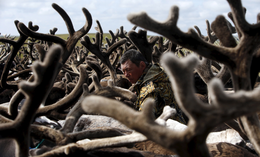 A herder works among reindeer at a camping ground, some 200 kilometers (124 miles) northeast of Naryan-Mar, the administrative center of Nenets Autonomous Area, far northern Russia, on August 2, 2015. People, including local herders and members of their families, gathered at the site to mark Reindeer Day, a professional holiday of reindeer-breeding workers, which is celebrated annually on August 2.Sergei Karpukhin / Reuters