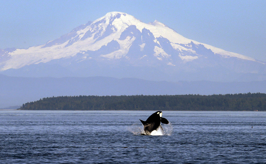 An orca whale breaches in view of Mount Baker, some 60 miles distant, in the Salish Sea in the San Juan Islands, Washington, on July 31, 2015. The Southern Resident killer whales living in the area have lost about 20 percent of their population since the 1990s, likely because of dwindling food sources and contamination. This particular group of whales, now numbering at 81, is endangered.Elaine Thompson / AP