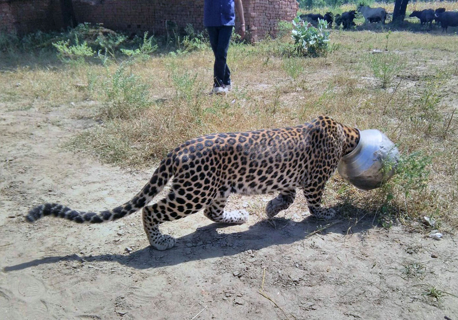 A leopard walks through a field after getting its head stuck in a pot in the Indian village of Sardul Kheda in the Rajasthan district of Rajsamand on September 30, 2015. The leopard spent between four and five hours wearing the pot, but was eventually freed after being tranquilized by the forestry department.AFP / Getty