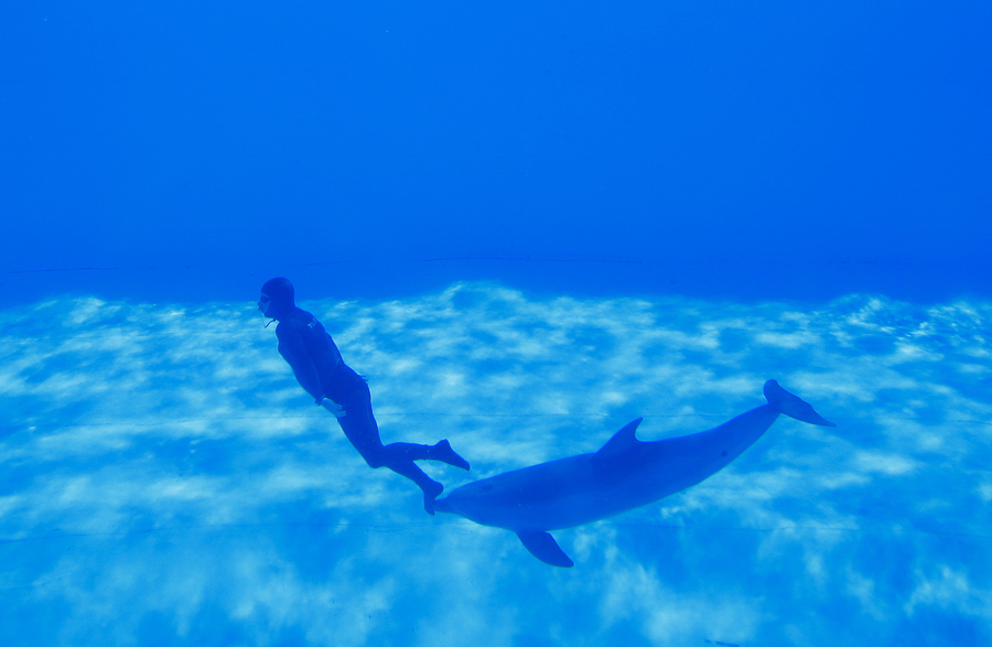 Simone Arrigoni of Italy attempts to set an apnea diving record while being pushed by a dolphin in Torvaianica, near Rome, Italy, on May 28, 2015. According to Arrigoni's publicist, he completed seven loops in 1 minute and 30 seconds to set the record.Tony Gentile / Reuters