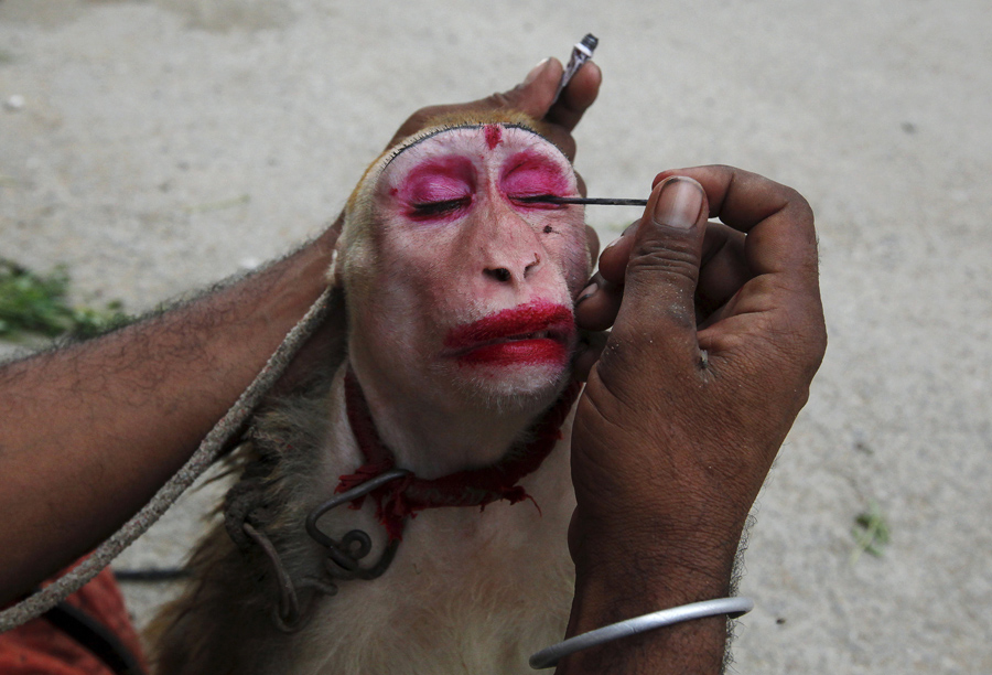 A man applies kohl eye makeup to his pet monkey, named Gulabo, or “Pinky,” before it performs tricks for money along streets in Karachi, Pakistan, on May 31, 2015.Akhtar Soomro / Reuters