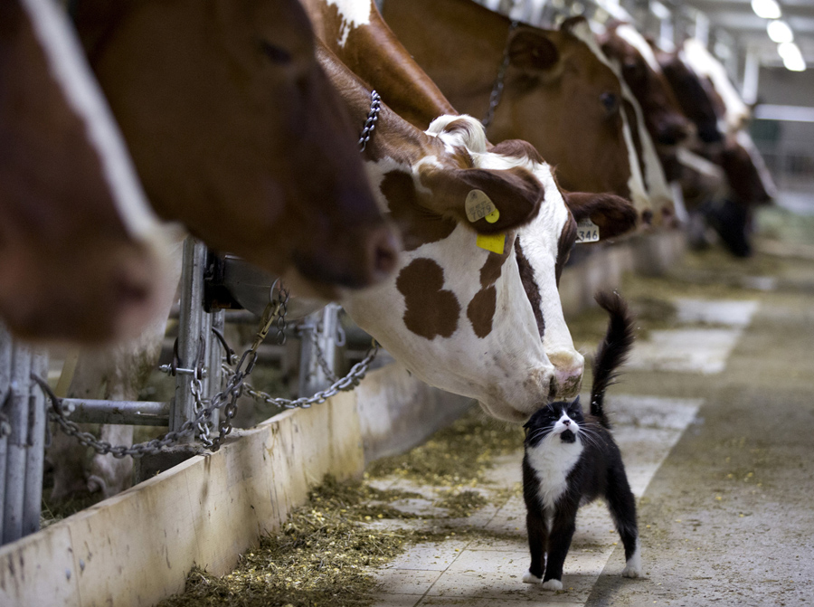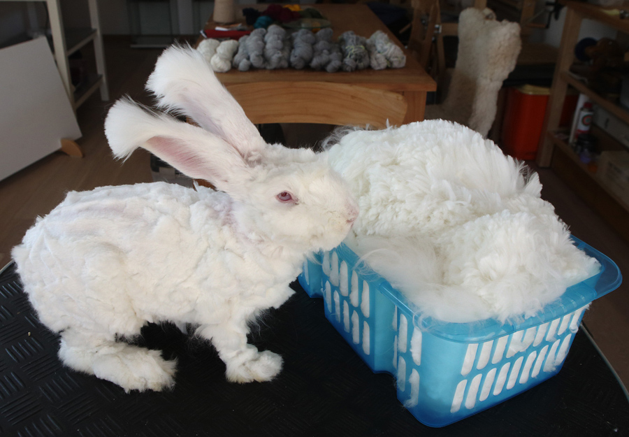 Angora rabbit Emilson sits next to its freshly shaved hair at Georgia Spausta's small farm in Herzogbirbaum, Austria, on March 10, 2015. Spausta produces hand-spun yarn from some 25 angora rabbits, which is sold in small scale to enthusiasts or at local markets. The rabbits are clipped four times a year, each time giving some 300 grams of wool, about the amount needed to knit one pullover.Heinz-Peter Bader / Reuters