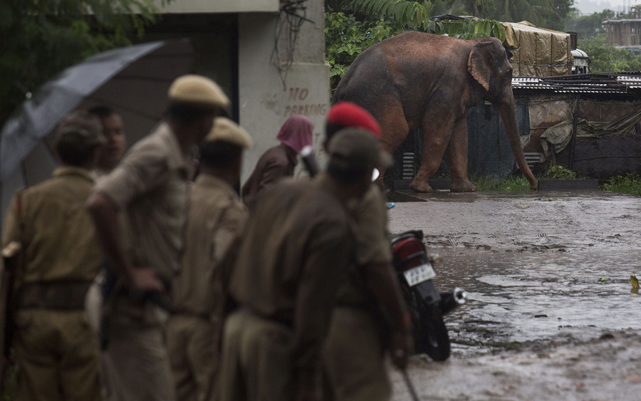 Indian police officials watch a confused wild male elephant, who got separated from his herd, walking in a compound on the outskirts of Gauhati, India, on August 20, 2015. The herd of wild elephants was coming down from a nearby hill of India’s northeastern state of Meghalaya. As the pressure of population pushes human habitation closer to forests, incidents of wild animals straying into cities are increasingly reported. No incident involving the wild elephant was reported.Anupam Nath / AP