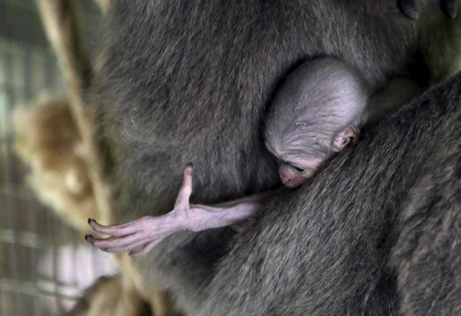 A newborn silvery gibbon baby is held by its mother, Alangalang, at Prague Zoo, Czech Republic, on July 30, 2015. The baby silvery gibbon, an endangered species, was the first one born in captivity in the Czech Republic, according to the zoo.David W Cerny / Reuters