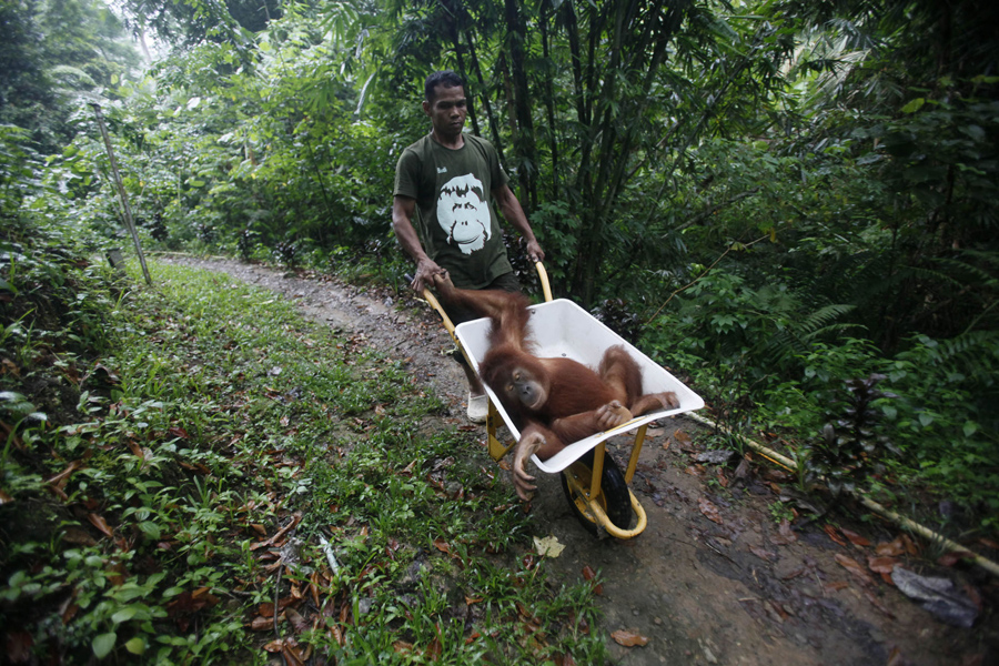 A worker of the Sumatran Orangutan Conservation Program wheels a tranquilized Sumatran orangutan as it's being prepared to be released into the wild at a rehabilitation center in Kuta Mbelin, North Sumatra, Indonesia, on July 10, 2015. The orangutans at the center were mostly rescued from palm oil plantations or confiscated from homes where they were kept as pet animals. Orangutan populations in Indonesia's Borneo and Sumatra island are facing severe threats from habitat loss, illegal logging, fires. and poaching. Conservationists predict that without immediate action, orangutans are likely to be the first great ape to become extinct in the wild.Binsar Bakkara / AP