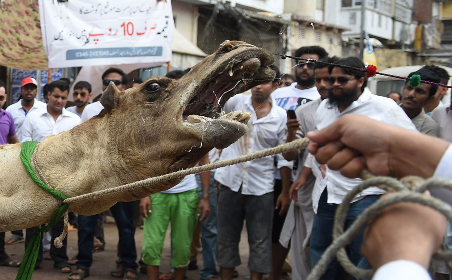 Pakistani men slaughter a camel on the second day of the Eid al-Adha festival in Karachi on September 26, 2015. Muslims across the world are celebrating the annual festival of Eid al-Adha, or the Festival of Sacrifice, which marks the end of the Hajj pilgrimage to Mecca and commemorates the prophet Abraham’s readiness to sacrifice his son to show obedience to God.Rizwan Tabassum / AFP / Getty