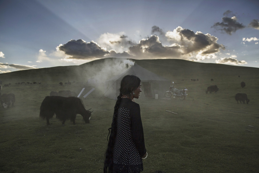 An ethnic Tibetan nomad woman stands with her Yak herd at their summer grazing area on July 24, 2015, on the Tibetan Plateau in Yushu County, Qinghai, China. Tibetan nomads face many challenges to their traditional way of life, including political pressures, forced resettlement by China's government, climate change, and rapid modernization. The Tibetan Plateau, often called "the Roof of the World," is the world's highest and largest plateau.Kevin Frayer / Getty