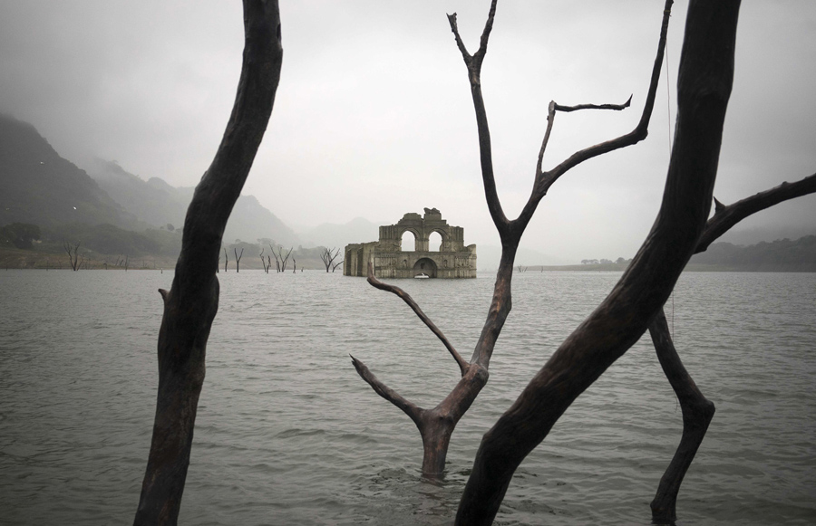 The remains of a mid-16th century church known as the Temple of Santiago, as well as the Temple of Quechula, visible above the surface of the Grijalva River, which feeds the Nezahualcoyotl reservoir—low, due to the lack of rain near the town of Nueva Quechula, Mexico, on October 16, 2015. The temple, built by Dominican friars in the region inhabited by the Zoque people, was submerged in 1966 when the Nezahualcoyotl dam was built.David von Blohn / AP