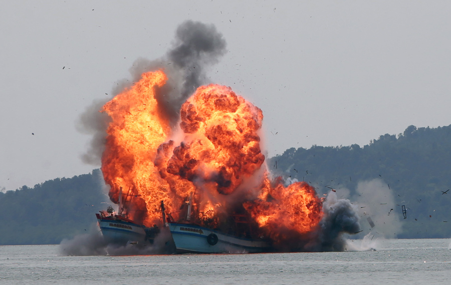 A fireball goes up as foreign fishing boats are destroyed by the Indonesian Navy off Batam Island, Indonesia, on October 20, 2015. Authorities sank several foreign fishing boats caught operating illegally in the Indonesian waters as part of the country's campaign to battle illegal fishing.Kanwa / AP