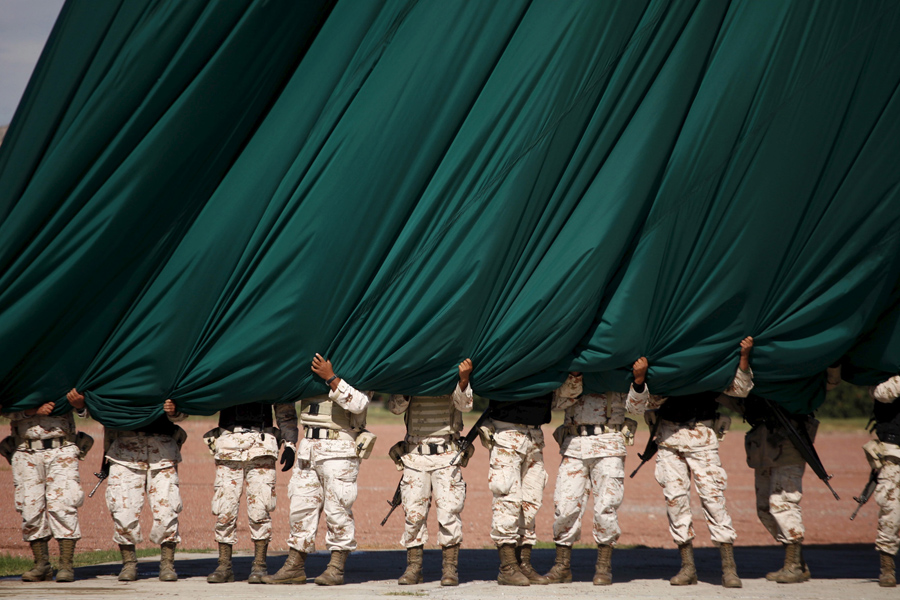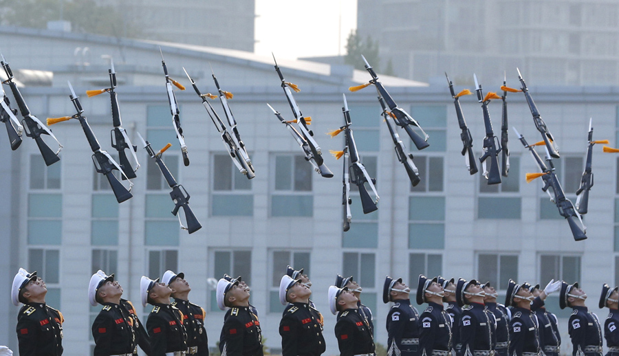 Members of the South Korean honor guard throw their guns in the air during the honor guard ceremony for the Seoul International Aerospace and Defense Exhibition 2015, ADEX 2015, at the Defense Ministry in Seoul, South Korea, on October 20, 2015.Lee Jin-man / AP