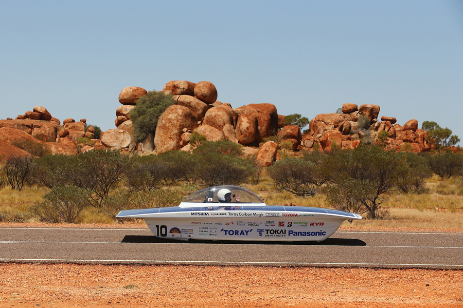 Tokai Challenger of Tokai University Japan passes through Karlu Karlu (The Devils Marbles) as it races in the Challenger Class during day two of the 2015 World Solar Challenge on October 19, 2015 near Tennant Creek, Australia. Teams from across the globe are competing in the 2015 World Solar Challenge - a 3000 km solar-powered vehicle race between Darwin and Adelaide.Mark Kolbe / Getty for The World Solar Challange