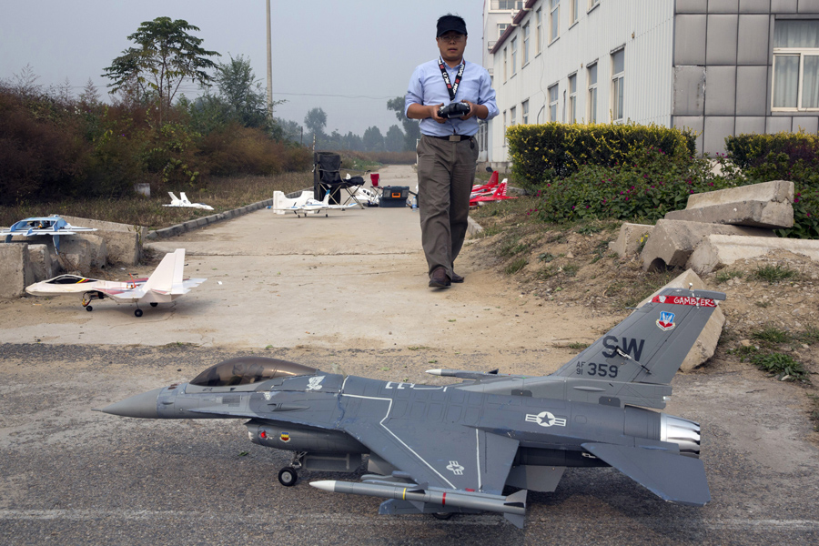 A man prepares to launch a remote control plane on the outskirts of Beijing, China, on October 17, 2015. China's heavily regulated airspace means enthusiasts of remote control vehicles and commercial application of drones remain stunted.Ng Han Guan / AP
