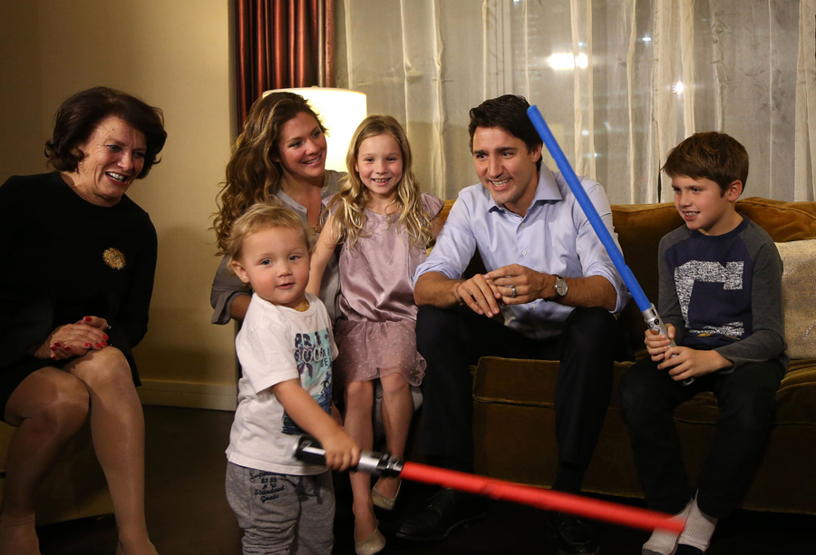 Liberal leader Justin Trudeau is accompanied by his mother Margaret Trudeau (left) and his wife Sophie Gregoire, daughter Ella Grace and sons Hadrien (foreground) and Xavier as he watches results at his election night headquarters in Montreal, Quebec, Canada, on October 19, 2015. A late campaign surge propelled the Liberal party to an election victory on Monday, making Trudeau Canada’s new prime minister-designate.Chris Wattie / Reuters
