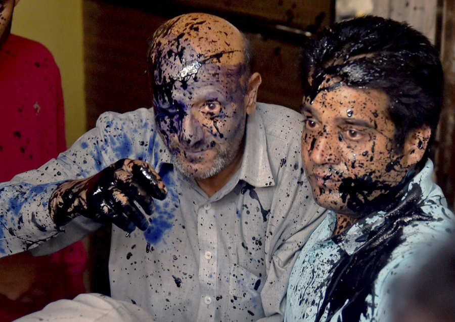 Jammu and Kashmir lawmaker Abdul Rashid Sheikh, left, reacts after suspected activists of a right-wing organization threw ink on his face after he addressed a press conference in New Delhi, India, on October 19, 2015. According to local reports Rashid had been protesting against the death of a Muslim teenager attacked by a Hindu mob over rumors of cows being slaughtered.Kamal Singh / Press Trust of India / AP