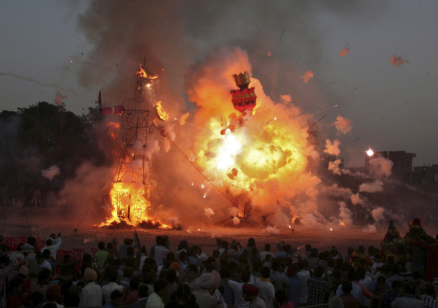 People watch as effigies of demon King Ravana (center), his brother Kumbhkarana and son Meghnad (right) are burned during the Hindu festival of Dussehra in Amritsar, India, on October 22, 2015. Effigies of the 10-headed Demon King "Ravana" are burnt on Dussehra, the Hindu festival that commemorates the triumph of Hindu god Rama over the Ravana, marking the victory of good over evil.Munish Sharma / Reuters