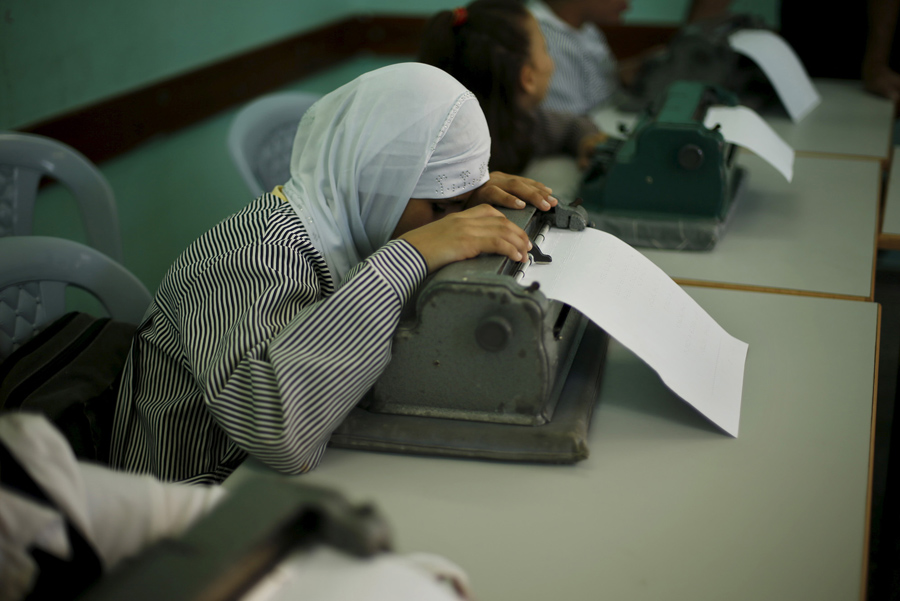 A blind Palestinian girl uses a Braille system typewriter in her classroom at a United Nations Relief and Work Agency-run al-Nour (Light) school for blind and visually impaired children in Gaza.Mohammed Salem / Reuters