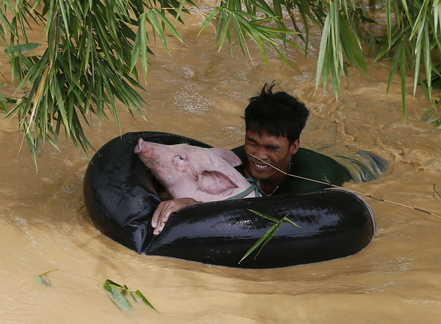 A resident uses an inflated tire interior to bring a pig to safety amidst raging floodwaters brought about by Typhoon Koppu at Zaragosa township, Nueva Ecija province, north of Manila, Philippines, on October 19, 2015.Bullit Marquez / AP