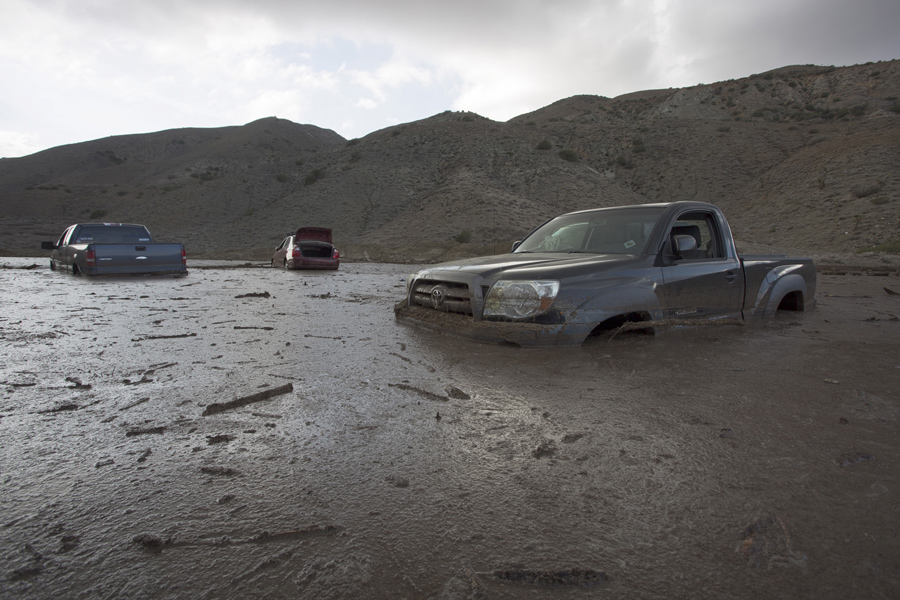 Cars and trucks remain mired in mud and debris on State Route 58 near Tehachapi, California, about 60 miles (97 km) outside of Los Angeles, on October 17, 2015. A mudslide on Thursday left nearly 200 vehicles, including 75 semi-trailer trucks, stuck in up to five feet of mud, local sheriff's spokesman Ray Pruitt said.David McNew / Reuters
