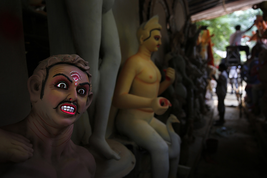 An idol of a demon king stands in the foreground as artists work on idols of the Hindu goddess Durga in preparation for the upcoming Durga Puja festival in New Delhi, India, on October 7, 2015. The festival, to be celebrated from October 19 to 22, commemorates the slaying of a demon king by the lion-riding, 10-armed goddess Durga, marking the triumph of good over evil.Manish Swarup / AP