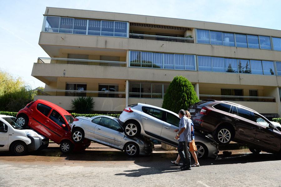People pass cars stacked onto one another on October 4, 2015, in Mandelieu-la Napoule, France, after violent storms and flooding along the French Riviera killed at least 13 people, emergency responders and local officials said.Boris Horvat / AFP / Getty