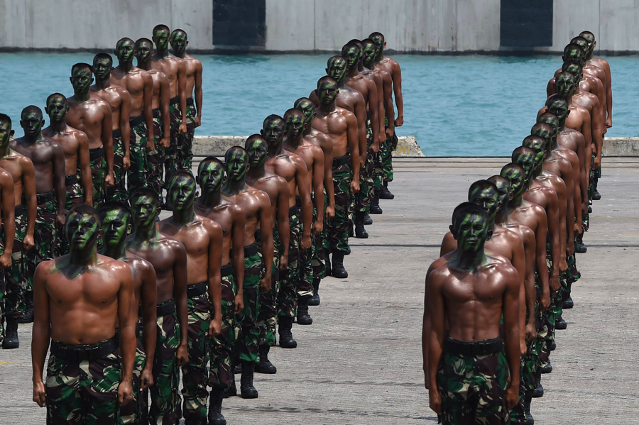 Indonesian military troops prepare for a demonstration during an exercise at a naval base in Cilegon, Banten Province, on October 3, 2015, in preparation for the 70th-anniversary celebration of the Indonesian Armed Forces on October 5.Romeo Gacad / AFP / Getty