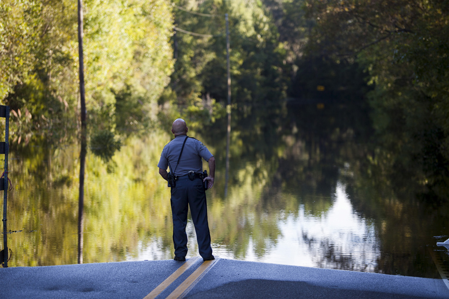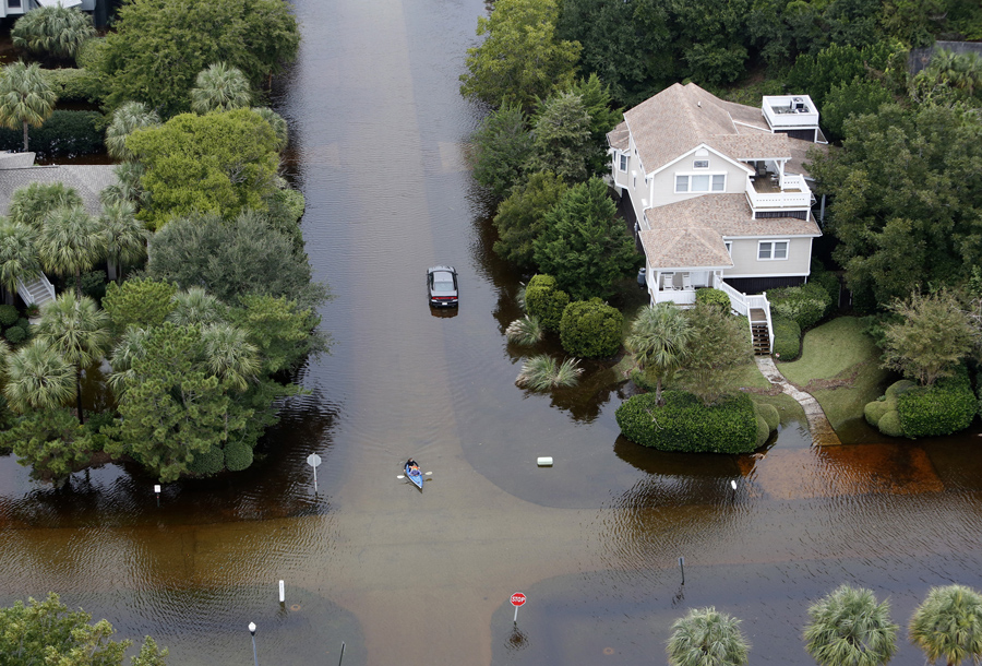 A kayaker makes her way through floodwaters on Sullivan's Island, South Carolina, on October 5, 2015. The Charleston and surrounding areas are still struggling with floodwaters due to a slow-moving storm system.Mic Smith / AP