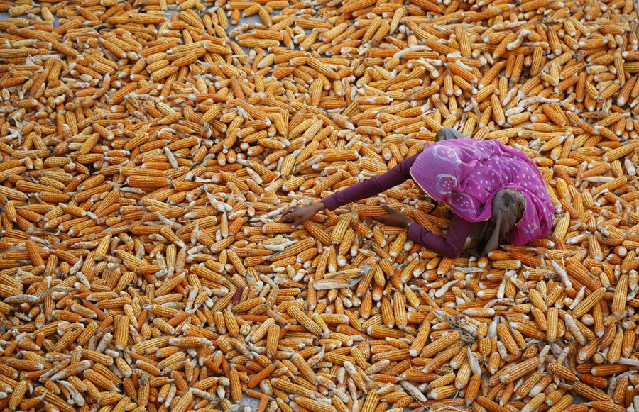 An Indian farmer dries a maize crop at the village of Aloli, about 90 kilometers (56 miles) southeast of Ajmer, in India’s western state of Rajasthan, on October 8, 2015.Deepak Sharma / AP
