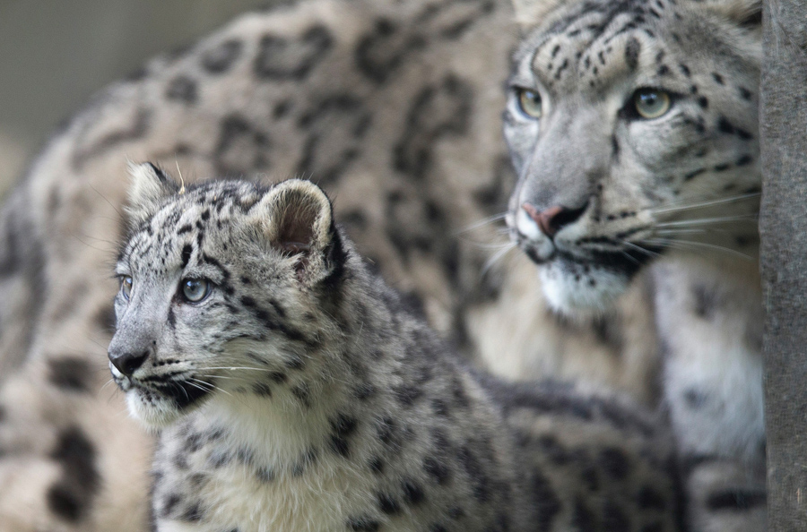 Sarani, a female snow leopard, explores her habitat with one of two of her 4-month old cubs that were making their public debut at the Brookfield Zoo on October 7, 2015 in Brookfield, Illinois. With an estimated 4,000 to 6,500 remaining in the wild, snow leopards are listed as an endangered species by the International Union for Conservation of Nature.Scott Olson / Getty