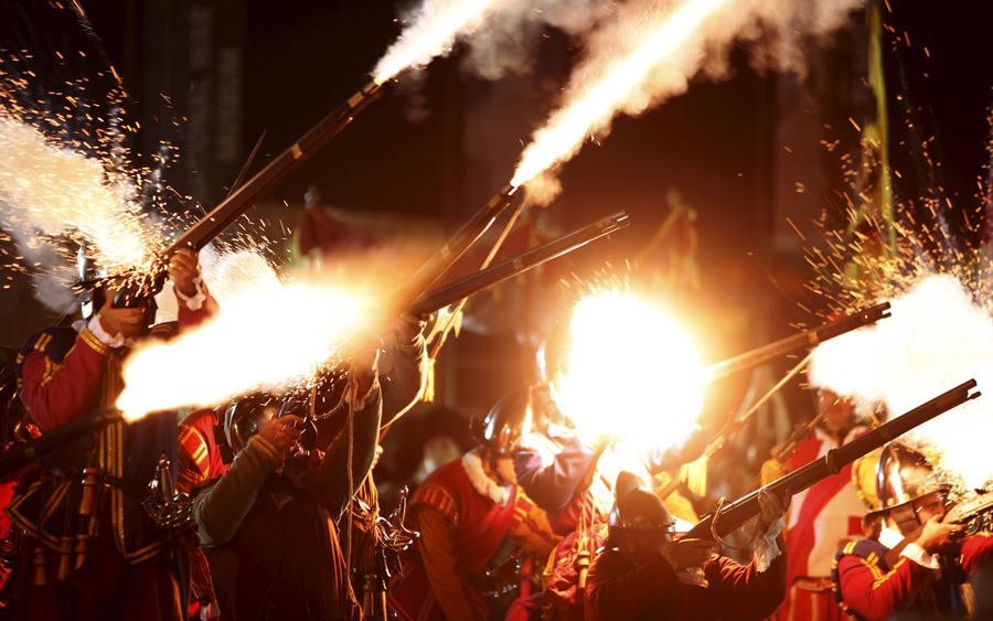 Re-enactors fire their muskets during a historical reenactment of the inspection of Fort St. Elmo during Notte Bianca (White Night) celebrations in Valletta, Malta, on October 3, 2015.Darrin Zammit Lupi / Reuters