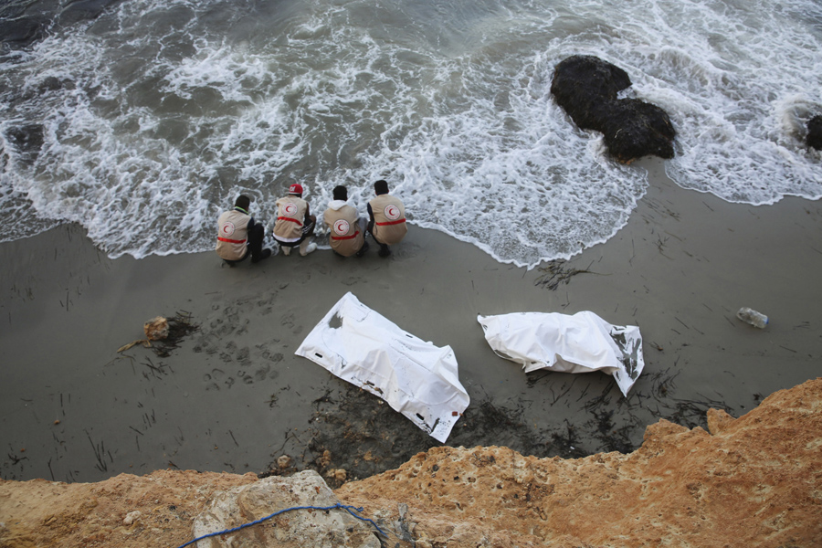 Members of the Libyan Red Crescent wash their hands at the shore after they placed bodies of migrants found on the eastern shore of Tripoli, Libya, into bags on October 3, 2015.Mohamed Ben Khalifa / AP