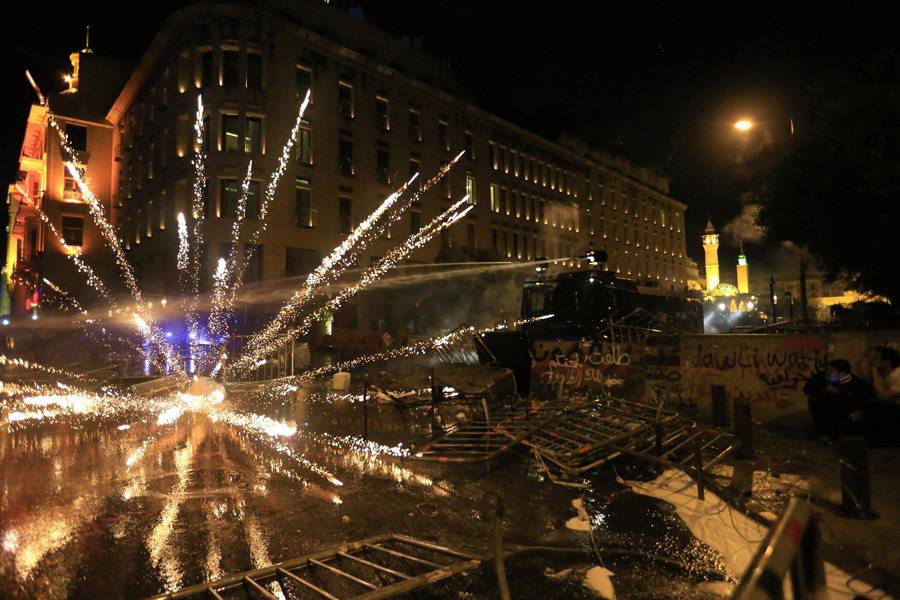 A firework launched by Lebanese anti-government protesters as they were sprayed by water cannons during a protest against the ongoing trash crisis and government corruption in downtown Beirut, Lebanon, on October 8, 2015. Lebanese security forces used water cannons and eventually fired tear-gas canisters to disperse dozens of anti-government protesters who tried to get past security barricades and reach Parliament.Hassan Ammar / AP