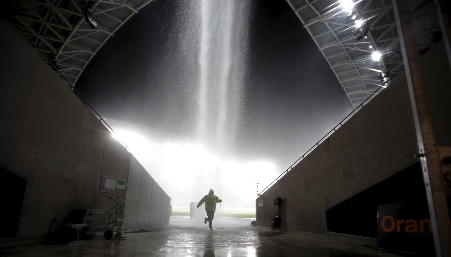 A man runs to protect himself from heavy rain as the France Ligue 1 soccer match between Nice and Nantes is stopped at Allianz Riviera stadium in Nice, France, on October 3, 2015.Eric Gaillard / Reuters