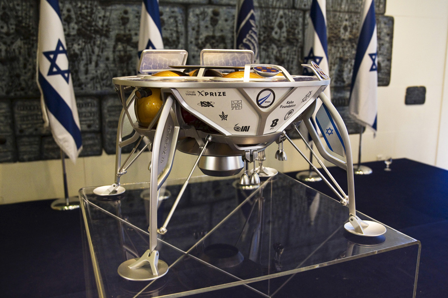 A model of an Israeli spacecraft is displayed on a podium before a meeting between Israeli President Reuven Rivlin and the Israeli space team, SpaceIL, in Jerusalem on October 7, 2015. The Israeli team, competing in a race to the moon sponsored by Google, has signed a with California-based SpaceX for a rocket launch, putting it at the front of the pack and on target for blast-off in late 2017, officials said.Ronen Zvulun / Reuters
