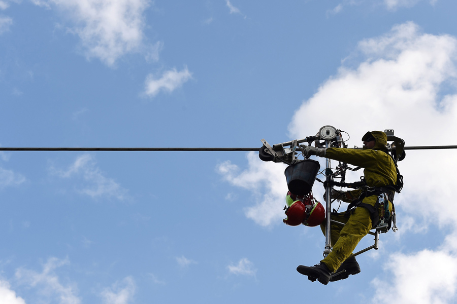 An electrician of RTE, the electricity transmission system operator of France, works on a high-tension line of 225,000 volts on October 9, 2015, in Eygalieres, southern France.Boris Horvat / AFP / Getty