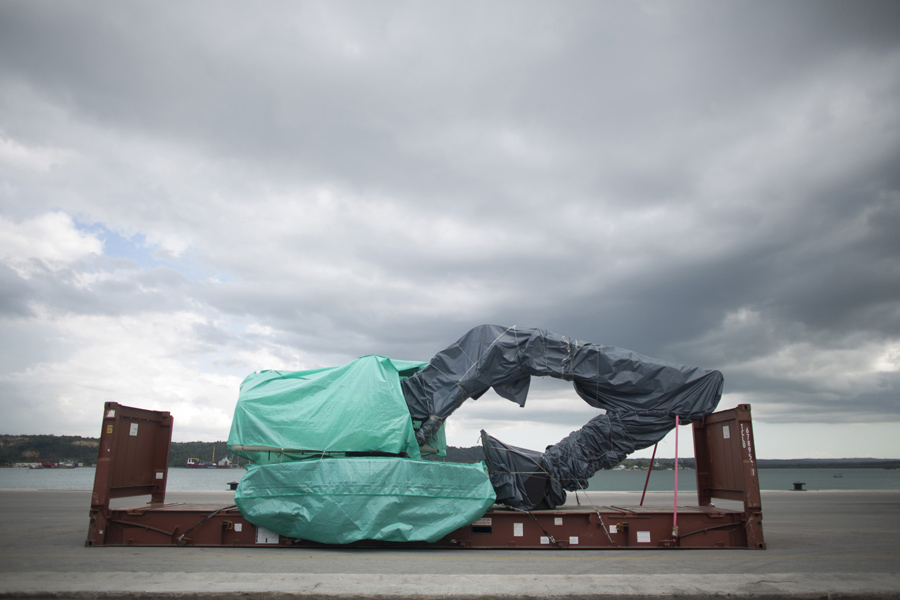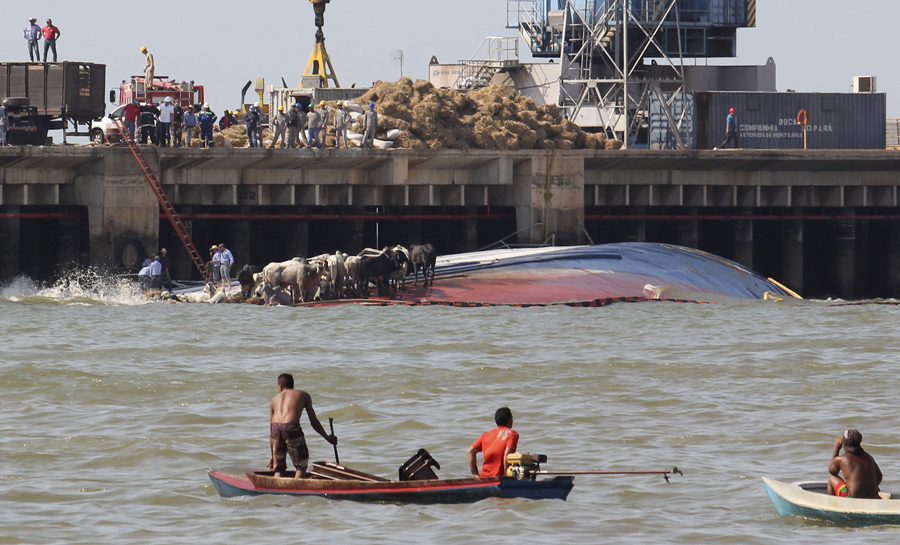 People look at cows perched on the side of the sunken livestock carrier Haidar, loaded with some 5,000 cattle, after it capsized at the Vila do Conde port in Barcarena, Brazil, on October 6, 2015. Thousands of cows drowned, with no human casualties, after the ship capsized while getting getting ready to depart for Venezuela, according to port authorities and local media. Some of the livestock managed to escape from the ship's hold.Ney Marcondes / Reuters