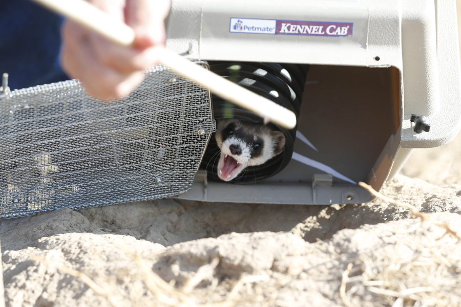 A black-footed ferret belts out a warning during a release of 30 black-footed ferrets by the U.S. Fish and Wildlife Service at the Rocky Mountain Arsenal National Wildlife Refuge in Commerce City, Colorado, on October 5, 2015. The rare black-footed ferrets were turned loose on the 25-square-mile refuge, which was a former toxic waste site before being reclaimed after a $2.1 billion cleanup.David Zalubowski / AP