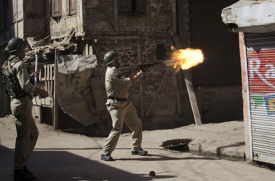 An Indian policeman fires a rubber bullet toward Kashmiri protesters during a protest in Srinagar, Indian-controlled Kashmir, on October 9, 2015. Police fired teargas and rubber bullets to disperse hundreds of Kashmiris who gathered after Friday afternoon prayers to protest against the arrest of separatist leaders and civilians. They were also protesting against what they said were attempts by the coalition government of the Bharatiya Janata Party and the regional Peoples Democratic Party to divide residents on the basis of religion and choking political space in the restive state.Dar Yasin / AP