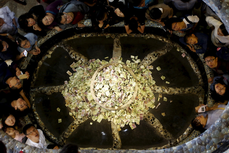 Visitors look up while they listen to a tour guide's explanation as they stand next to a jar overflowing with Chinese banknotes during the National Day holiday at Porcelain House in Tianjin, China, on October 3, 2015. The banknotes were placed by visitors wishing for good fortune. Porcelain House, also known as China House, is a museum displaying pottery and antiques, and its exterior and interior is decorated with hundreds of millions of ancient porcelain flakes, ancient bowls, dishes, and vases.Kim Kyung Hoon / Reuters