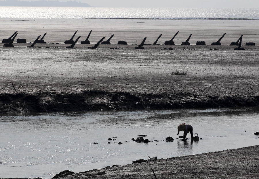 A woman collects oysters on a beach near anti-landing barricades in Kinmen County, Taiwan, on September 8, 2015. Rustic Kinmen, with a population of less than 129,000, is a half-hour ferry ride from China, but it takes an hour to fly to major Taiwanese cities.Pichi Chuang / Reuters