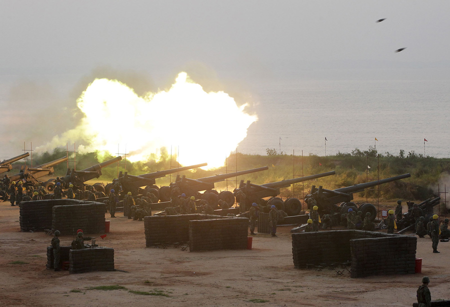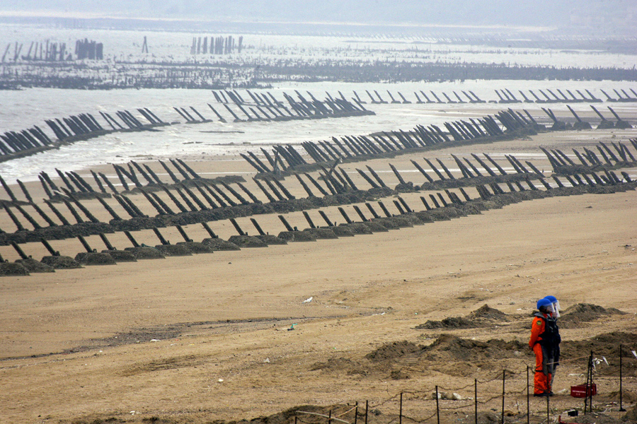 A soldier from a mine disposal unit stands in front of anti-landing barricades along a coast in Kinmen on May 18, 2009. In 2009, Taiwan removed many of its underwater naval barricades and landmines on beaches in the former military outpost of Kinmen for a cross-strait swimming event.Pichi Chuang / Reuters