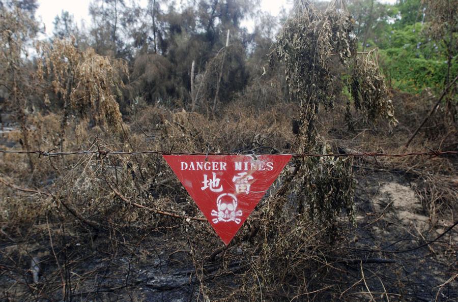 A warning sign is displayed on territory lined with landmines on Kinmen Island, Taiwan, on May 18, 2009. Tens of thousands of the mines were first planted back in the 1950s, when this Taiwanese beachhead was subjected to frequent Chinese shelling and war was a constant threat. The Taiwanese military has now cleared an estimated96,000 mines concentrated in 154 fields around the island's perimeter.Chiang Ying-ying / AP