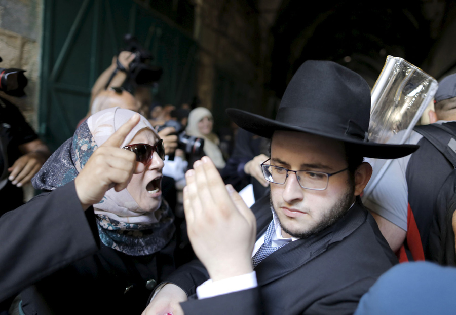 Palestinian women gesture at an Israeli man during a protest by Palestinian women against Jewish visitors to the compound known to Muslims as Noble Sanctuary and to Jews as Temple Mount in Jerusalem’s Old City on September 28, 2015.Ammar Awad / Reuters