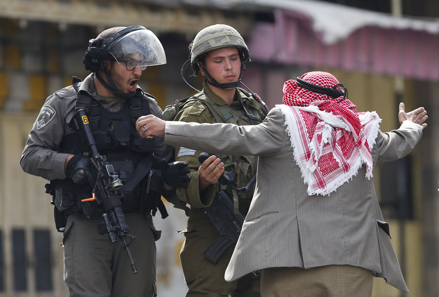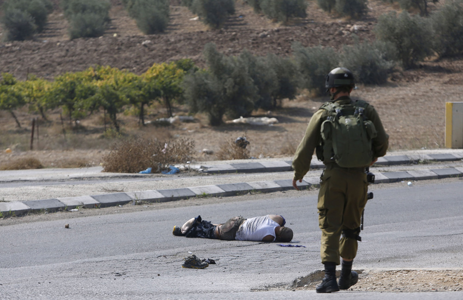 An Israeli soldier shoots and kills a Palestinian holding a knife after he stabbed another Israeli soldier, seen kneeling, during clashes in Hebron, West Bank, on October 16, 2015. The Palestinian man, wearing a yellow “press” vest and a T-shirt identifying him as journalist, stabbed and wounded an Israeli soldier before being shot dead by troops, the latest in a monthlong spate of attacks.Nasser Shiyoukhi / AP